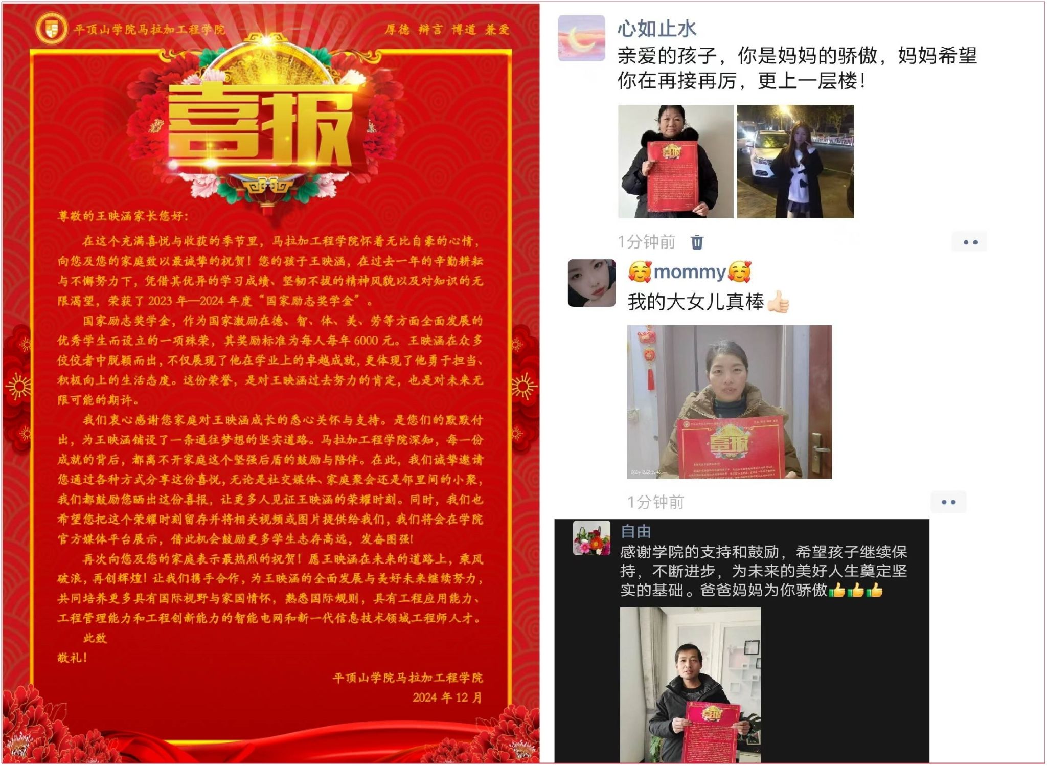 2024年12月26日,英国365集团官网为荣获2023—2024年度国家励志奖学金的14名员工家长邮寄喜报,让他们共同见证员工在校期间的成长与荣耀,使这份荣誉与家庭的温暖紧密相连。
