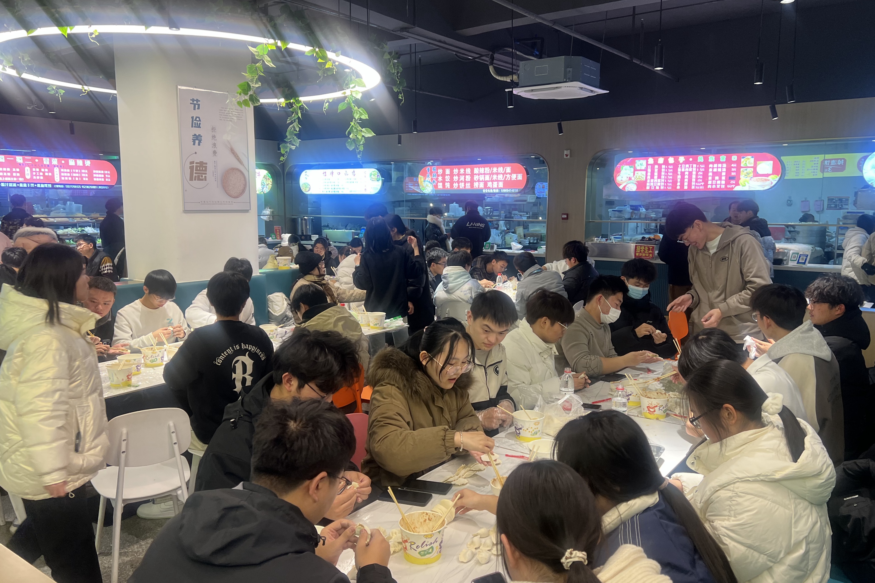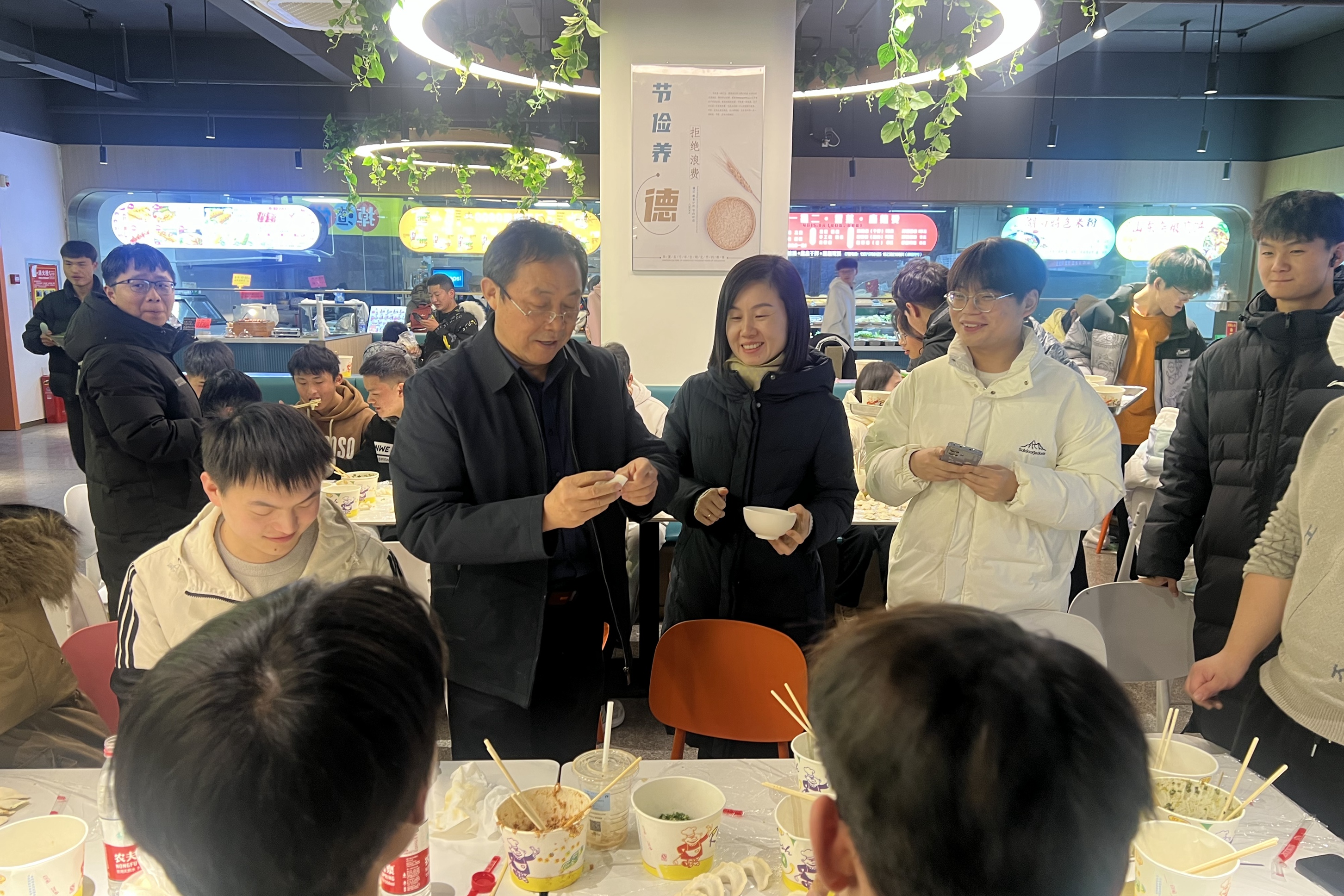 冬至阳生春又来,作为二十四节气中重要的一员,冬至一直承载着人们对于新的一年的美好期待。于长立走进餐厅与员工一起包饺子,大家一边包饺子一边交流着各自家乡的风俗。临近期末,于长立细心地询问同学们在校的学习和生活情况,向大家致以节日的问候,让员工们近距离感受到公司的关怀与祝福。师生一起包饺子话家常,其乐融融,餐厅洋溢着温暖欢快的气氛。