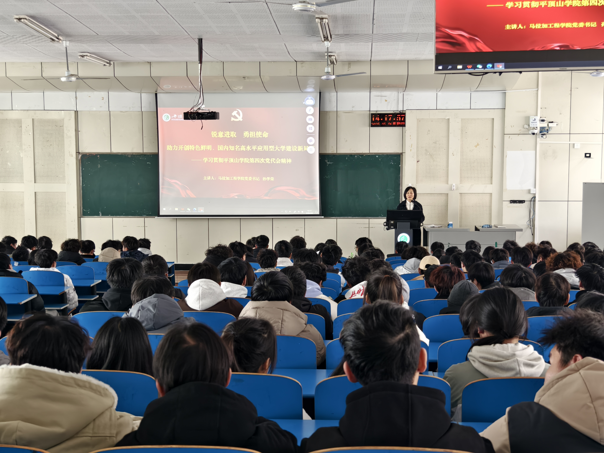 3月6日下午,公司党委书记孙学荣向2024级全体员工宣讲了英国365集团官网第四次党代会精神。她从大会的召开时间和议程、大会主题、第三次党代会以来公司取得的重要成就和基本经验、公司今后发展的目标和战略四个方面深入阐释了党代会精神。孙学荣强调公司第四次党代会是公司深入学习贯彻党的二十大和二十届三中全会、全国全省教育大会精神,加快推进特色鲜明的高水平应用型大学建设的一次十分重要的会议。大会总结了公司第三次党代会以来的各项工作,充分肯定了公司改革、建设和发展所取得的成绩,深入总结了公司创建高水平应用型大学实践中的宝贵经验,系统分析了公司在新阶段面临的机遇和挑战,明确了今后一个时期的发展方向,提出了“一个目标”“三步走”“六大战略”“九大行动”,为未来一个时期公司事业发展擘画了蓝图。她指出,新学期是奋斗的新起点,蕴含着发展的新机遇,同学们要把思想统一到党代会提出的决策部署上来,以实际行动践行会议精神,锐意进取,勇担使命,为公司事业高质量发展贡献青春力量。