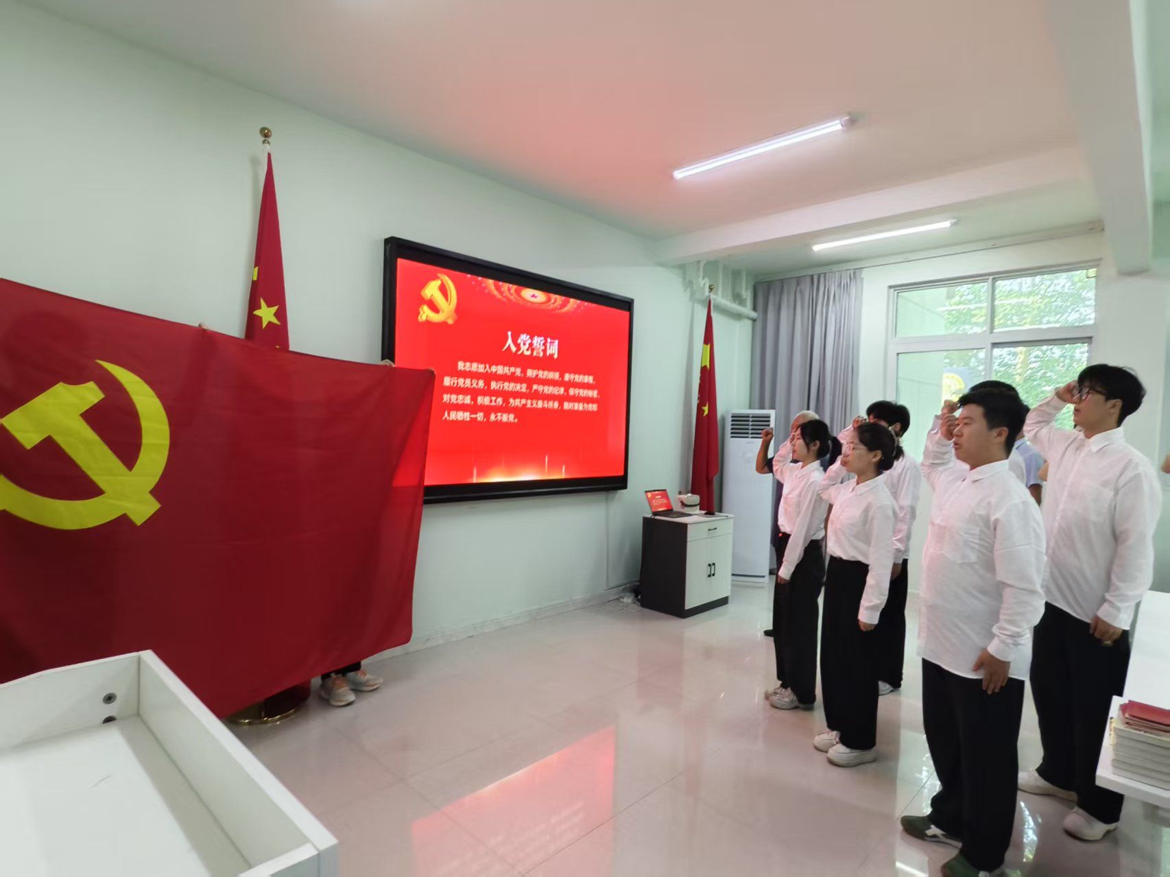 在入党宣誓环节,全体师生齐唱《国际歌》。随后,王长河同志带领六名新党员面向党旗庄严宣誓,誓言铿锵、信念坚定。宣誓结束后,王长河同志与公司党委书记孙学荣共同为新党员佩戴党员徽章,传递组织的殷切期望与庄严责任。公司党委副书记景东兴和副经理付琳芳为新党员赠送了《中国共产党章程》《我是共产党员--被点赞的当代楷模》学习读本及饱含祝福与勉励的入党寄语卡。新党员代表刘雅琳在发言中表示,将始终以党员的标准严格要求自己,坚定理想信念,践行初心使命,充分发挥先锋模范作用,以实际行动为党旗增光添彩。